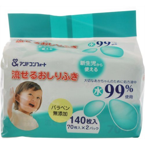 ●【商品説明】●「流せるおしりふき 140枚入(70枚×2パック)」は、トイレに流せる水解性パルプ不織布を使用したおしりふきです。●精製した水を99%以上使用し、赤ちゃんの手や体にもご使用いただけます。●ノンアルコール・無香料。●【使用上の注意】●傷やはれもの、湿疹等の異常がある時、お肌に合わない場合はご使用をおやめください。●トイレに流す時は、1枚ずつ流し、1度に複数枚流さないでください。●つまりの原因になります。●直射日光の当たる場所、高温になる場所には置かないでください。●乳幼児の手の届かない所で保管してください。●【成分】●水、BG、オレス12、ベンザルコニウムクロリド、ブチルカルバミン酸ヨウ化プロピニル、グリセレス-26、クエン酸、フェノキシエタノール●【素材】●パルプ不織布●【原産国】●日本●【お問い合わせ先】●大一紙工株式会社TEL:0120-101-342受付時間:10:00-17:00(土日祝日、年末年始は除く)●まとめ買いの場合、システムの仕様で個数分の送料が加算される場合がありますが、送料は1配送先につき1個分の金額となります。...