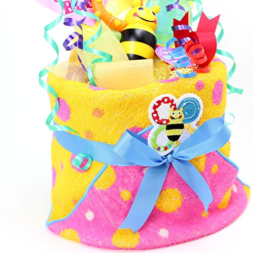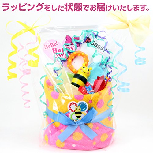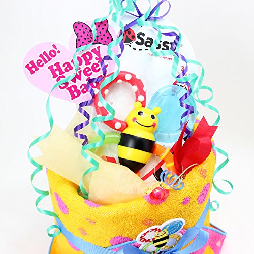 - パンパースの紙オムツとSASSYのポップな歯固め、タオルをケーキ風にデコレーションした可愛さと実用性をかねた『おむつケーキ』、ご出産のお祝いにどうぞ