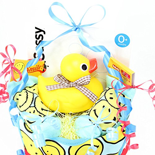 ご出産のお祝いにハッピーな贈り物♪オムツケーキ 《スマイリー ダッキー》 SASSYラバーダッキーとSMILEソックス&ビブのおむつケーキ (ブルー)