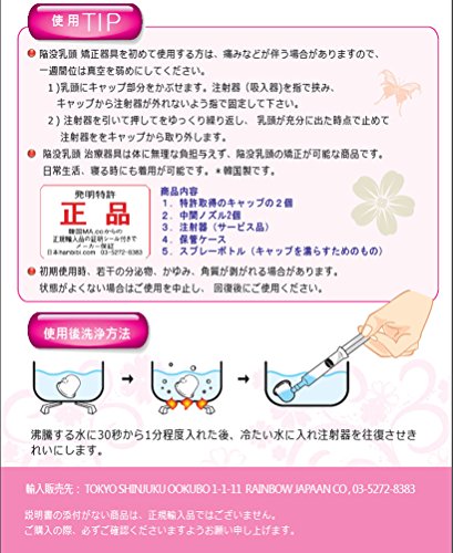 矯正器を着用したとき、乳首の痛みを防ぐ、赤ちゃんが噛んで 痛みがある時も保護してくれます。オリジナル 発明品、、、、、、、、、、 商品構成の中身、 1.特許取得キャップ2個 ,,, ,,, 2.中間ノズル2個,,, 3.注射器(サービス品),,, 4.保管ケース,,,, 5.特スプレーボトル(キャップを濡らす為に使用)、、、、 母乳授乳で悩んだら 乳頭陥没矯正商品