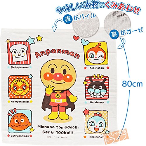 表がパイル、裏がガーゼの優しい素材のくみあわせのタオルです。大判で、お昼寝のタオルケット代わりにもお使いいただけます。アンパンマンと人気のキャラクターがデザインされたプレゼントにもオススメなプリントです。
