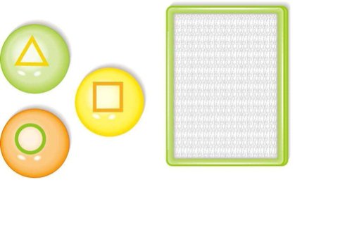 ![]() | 丸、三角、四角のスタンプがついて、スタンプ遊びも楽しめる。 |