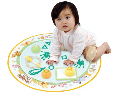 生まれてはじめておえかきするのに最適なスイスイおえかき。手型を押したり、スタンプ遊びも楽しめる。お水を入れたペンでかくから手や服、お部屋を汚さない。おえかきートは丸型でかわいいベビープーのデザイン。布製で折りたためるから、かたずけもカンタン。専用ペンは小さな子どもが持ちやすい形状。またペンの丸い筒の部分にカラービーズがはいっていて、振ると音が鳴る。