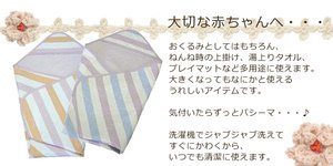 おくるみとしてはもちろん、ねんね時の上掛け、湯上りタオル、プレイマットなど多用途に使えます。大きくなっても使えるうれしいアイテムです。おうちの中だけでなく、おでかけやドライブなどにも