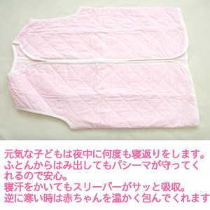 また寝汗をかいてもスリーパーがサッと吸収。逆に寒い時は赤ちゃんを温かく包んでくれます。