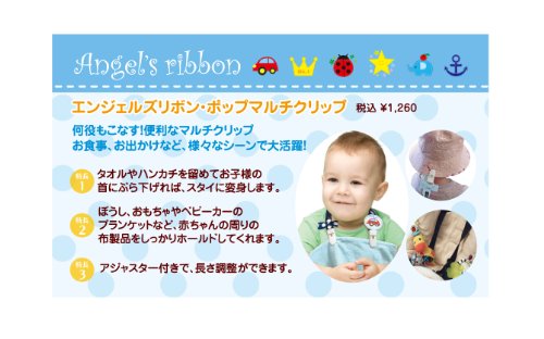 ●【商品説明】●「エンジェルズリボン ポップ マルチクリップ AR-PCLIP006 マリン」は、蝶ネクタイ風のリボンとポップな刺繍のワッペンがファッションをよりキュートにしてくれるマルチクリップです。●男の子にも女の子にも可愛いデザインです。●何役もこなす便利なマルチクリップ。●お食事、お出かけなど、様々なシーンで大活躍。●タオルやハンカチを留めてお子様の首にぶら下げれば、スタイに変身します。●ぼうし、おもちゃやベビーカーのブランケットなど、赤ちゃんの周りの布製品をしっかりホールドしてくれます。●アジャスター付きで、長さ調整ができます(25.5cm-37cm)。●【ご注意】●必ず保護者の目の届く範囲で使用してください。●赤ちゃんが予期しない行動をとり、ケガや事故の原因となるおそれがあります。●お子さまが誤って飲み込んだり、リボンが首に巻きつかないようご注意ください。●窒息の原因になります。●部品が外れたり、破損、変形した場合は直ちに使用を中止してください。●商品の用途以外ではご使用にならないでください。●生地によってはクリップの留まりが弱いもの、はさむと...