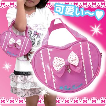 【45%オフ!】ハートの型のカバンがとてもラブリー! 水玉リボンにシルバーのハートチャームが付いたキッズバッグ!