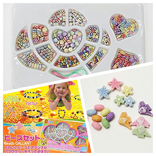「貝殻」「星」「アルファベット」「お花」「葉っぱ」「お魚」「ちょうちょ」「ヒトデ」など14種類のビース、2種類のテグス入りでこのセット1つでブレスレットやネックレスなどのアクセサリーを作って遊べるビーズセットです♪