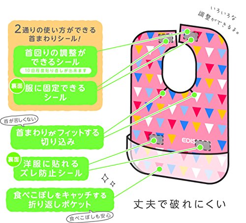 三層構造でしっかりガード! 不織布、パイル、ポリエチレンの安心の3層構造で水分をしっかりブロック! 外出時やご家庭でのお食事に便利なエプロン。使い捨てタイプだからいつでも清潔に使用できます。 ●食べこぼしをしっかりキャッチする折り返しポケット付き。 ●首ぐりの切込みで体にフィット。 ●貼り直しが出来るシールで首回りの調節ができます。 ●おなか部分のズレ防止シール付き。