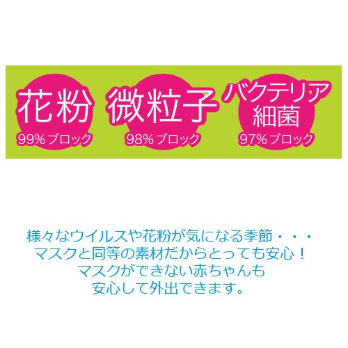 ・バギー用マスクは、ベビーカー使用時において外出中の乳児をバクテリア・細菌・浮遊している微粒子などから守ります。