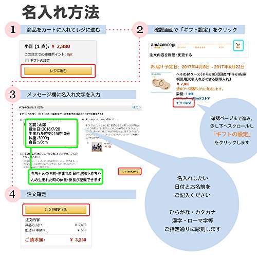 商品をカートに入れて購入手続きをお進みいただき、確認ページの「ギフトの設定」に名入れ文字をご記入ください。 詳しくは2枚目の画像をご参照ください。