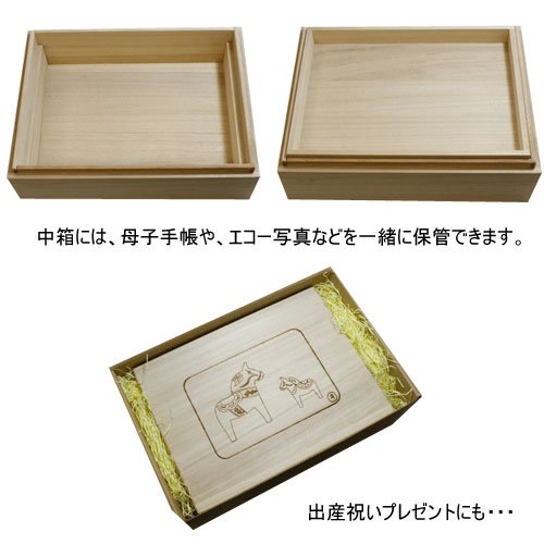 世界で一つだけの宝箱。天然の高級桐で制作した手作りのメモリアルボックス。 北欧では“幸せを呼ぶ馬”として大人気のダーラナホース。 そのダーラナホースを表面にデザインした二段式のメモリアルボックスです。 さらに、初めて切った髪の毛を入れるファーストヘアケース、マルチに使えるマルチケースをセットにしました。 マルチケースには、へその緒はもちろん、初めて切った爪や、初めてつけたアクセサリーなど、好きなものを入れてください。 中は、内箱がついている二段式。上の内箱には、へその緒ケースや乳歯ケース、母子手帳やエコー写真など。 下の箱赤ちゃんの時のお気に入りのおもちゃ、初めての洋服やシューズなどなど・・・。入れたいものがたっぷり収納できる大容量のメモリアルボックスです。母子手帳も余裕で入る大きさです。 桐ケースの特性 1.軽くて美しい/一般木材に比べ軽く、木肌も色白でやわらかく、まっすぐで美しい木目。 2.虫がつきにくく、腐りにくい/害虫に強いパウロニン、セサミンなど成分を含み、さらに防腐力あるため長期保存に優れている。 3.吸水性が高い/熱伝導が低く、また熱を受けても割れにくいのが特徴、また水の吸水性も高く湿気をしっかりカバーしてくれます。