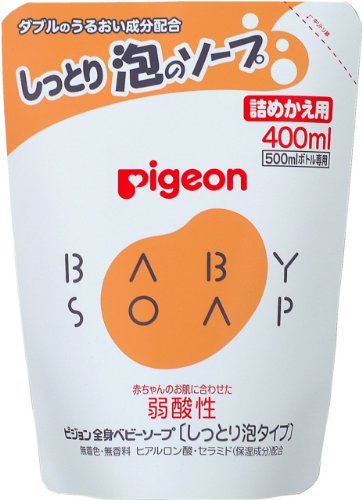 「ピジョン全身ベビーソープ(しっとり泡タイプ)詰めかえ用400ml」は、赤ちゃんのお肌の弱酸性値に着目したベビーボディシャンプーです。ダブルのうるおい成分(ヒアルロン酸、セラミド)でなめらかに洗い上げ、乾燥を防ぎ、しっとりすべすべ肌へ。皮ふアレルギーテスト済み(全ての方にアレルギーがおきないというわけではありません)。無着色、無香料。詰替え用。