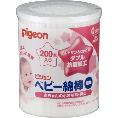 「ピジョン 細軸綿棒 徳用 200本入」は、綿球の部分が細い為、赤ちゃんの小さな耳や鼻のお手入れがムリなくできるベビー綿棒です。やわらかく衛生的な綿がしっかりと巻きついており、軸にはしなやかなペーパースティックを採用。綿球には抗菌加工が施されています。 使用上の注意 耳または鼻の奥に入れすぎないように、使用側の綿球の先端から1.5センチの部分を持ち、見える範囲でお使いください。お子様だけでのご使用はやめてください。万一、異常を感じた場合は医師にご相談ください。お子様の手の届かない所に保管してください。