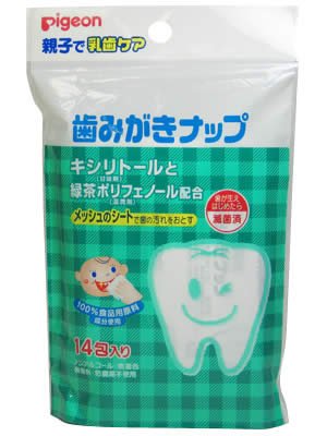 「親子で乳歯ケア 歯みがきナップ 14包入」は、赤ちゃんの歯の汚れをメッシュのデコボコがやさしく拭き取る、ウェットタイプの歯みがきナップです。キシリトールと緑茶ポリフェノール配合。1枚ずつ滅菌して包装してありますので、衛生的にお使いいただけます。ノンアルコール・無香料・無着色・防腐剤不使用。 販売元:ピジョン内容量:14包