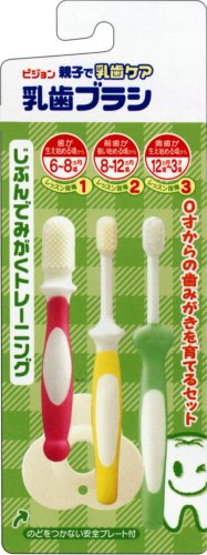 0歳からのベビーに、歯みがきを育てる歯ブラシセットです。柔らかいブラシ面が、歯や歯茎を傷つけず、表面の汚れを落とします。レッスン段階1から3までの歯ブラシで、自分で磨くトレーニング。のどをつかない安全プレート付き。