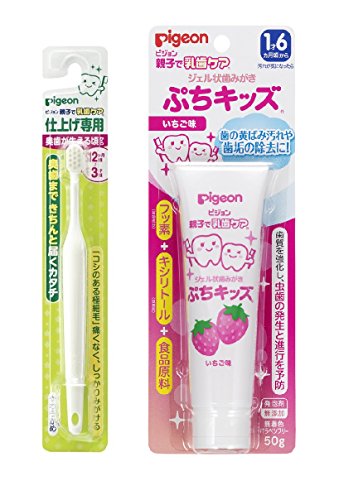 このセット買い商品には「ピジョン 仕上げ専用歯ブラシ やわらかめ 奥歯が生える頃(12ヵ月~3才頃)から」と「親子で乳歯ケア ジェル状歯みがき ぷちキッズ いちご味 50g」が含まれます