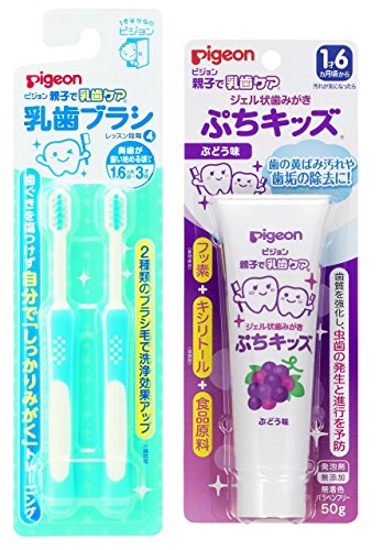 このセット買い商品には「ピジョン 乳歯ブラシ ブルー レッスン段階4 2本入 奥歯が揃い始める頃から(1才6ヵ月~3才頃)」と「親子で乳歯ケア ジェル状歯みがき ぷちキッズ ぶどう味 50g」が含まれます