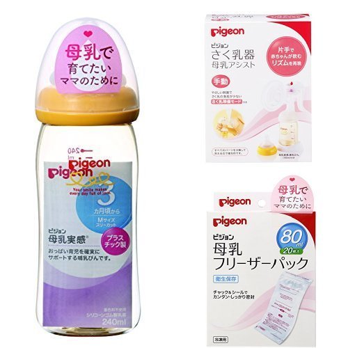 このセット買い商品には「ピジョン 哺乳びん 母乳実感 プラスチック製 オレンジイエロー 240ml」と「さく乳器 母乳アシスト 手動」と「母乳フリーザーパック 80ml 20枚入」が含まれます