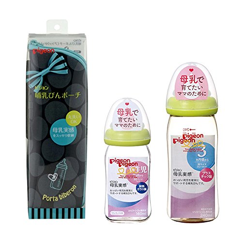 このセット買い商品には「ピジョン 哺乳びん 母乳実感 耐熱ガラス製 ライトグリーン 160ml」と「プラスチック製 ライトグリーン 240ml」と「哺乳びんポーチ(ブラックドット柄)」が含まれます