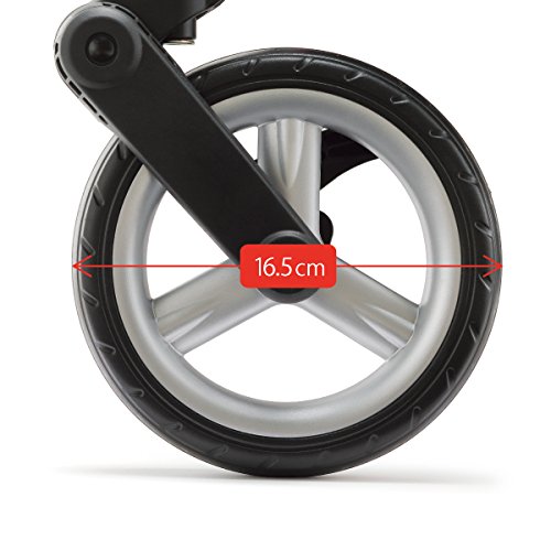 80%のママが段差をストレスと感じています。16.5cmの大きなタイヤは、段差をラクラクと乗り越えられる安心のサイズ。歩道に上がる時などの引っかかりが少なく、小さい力でベビーカーを押すことができます。