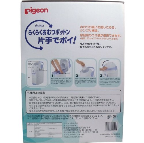 家庭用のゴミ袋が使用できます (推奨:50cmX70cmの30リットル相当) ・専用カセットは不要。 ・操作もお手入れもカンタンです。 【使用方法】 (1)使用する袋を、袋ホルダーの穴に通し、本体の底に付いた位置で、袋をセットします。余った袋の上部を袋ホルダーと本体の間へ入れ込みます。 (2)回転ドラムのポケットに使用済みおむつを入れます。(※おむつについた便は、事前にトイレに流してください。) (3)ハンドルを手前方向に回転させ、回転ドラムのポケットを閉じてください。おむつが袋の中へ落ちていきます。ハンドルを後方へ倒し、ドラムの位置を戻してください。おむつのにおいが漏れにくくなります。 【使用上の注意】 ・本製品はおむつを処理するための商品です。用途以外の使用はご遠慮ください。 ・回転ドラムやトップカバーの開閉の際などに指を挟まないよう、十分にご注意ください。 ・お子様には使用させないでください。また、お子様の手の届くところには置かないでください。 特に小さなお子さまが可動部に指をはさむと、思わぬ事故が発生する恐れがありますので十分にご注意ください。 窒息の恐れがありますので、小さなお子様が袋をかぶったりしないよう、十分にご注意ください。 ※おむつの破棄方法についてはお住まいの各自治体の指示に従ってください。 ※ご使用前に必ず取扱い説明書をお読みのうえ、正しくご使用ください。