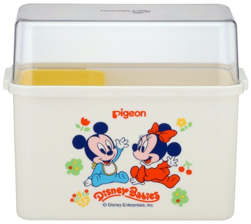 哺乳びんと乳首を衛生的に保管するのに便利な、ベビーミッキーとミニーのイラスト付きミルケース。哺乳びんをすっきりと乾燥させる水切りトレイ、乳首やフードの収納が可能な乳首トレイ付き。薬液消毒ケースとしても使用可能。