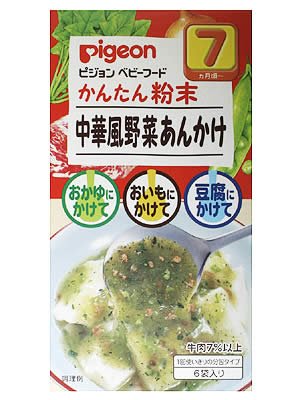 「ピジョン ベビーフード かんたん粉末 中華風野菜あんかけ 6袋入」は、ほうれん草などの野菜と牛肉が入った、ごま油の香りが豊かな中華風あんかけです。ご家庭にある買い置き食材にかけたり、あえたりするだけ。離乳食のレパートリーが広がります。離乳中期(7ヶ月頃)から離乳完了期頃まで。着色料、保存料、香料、化学調味料は使用しておりません。 内容量 : 19.8g(3.3g*6袋)