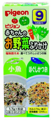 【商品説明】 たくさんの種類の野菜を使った、選ぶ楽しさが広がるアソートふりかけです。 緑黄色野菜を5種類配合。 カルシウム・鉄分・食物繊維・DHA入り カルシウムと鉄分は、1日の必要量の1/4摂取可能。 塩分控えめ。子ども用ふりかけの約1/2です。 着色料・保存料・香料は使用していません。 原材料に含まれるアレルギー物質 【小魚】乳、小麦、大豆【ほぐしかつお】乳、小麦、大豆(厚生労働省選定25品目) ※本品製造工場では落花生、卵を含む製品を製造しています。 内容量:6袋(1袋1.7g) 使用開始月齢:9ヵ月頃から 【JANコード】 4902508133517 【発売元】 ピジョン ※パッケージデザイン・成分等は予告なく変更されることがあります。