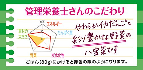 - 原材料:野菜(たまねぎ、にんじん、とうもろこし、グリーンピース、白菜、ピーマン)、いか団子(いか、つなぎ(でん粉、パン粉、小麦たん白、乾燥卵黄、小麦粉、大豆たん白)、たまねぎ、砂糖、食塩、植物油脂)、チキンエキス、しょうゆ、食塩、バター、酵母エキス、ごま油、増粘剤(加工でん粉)