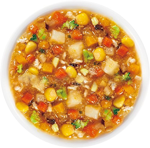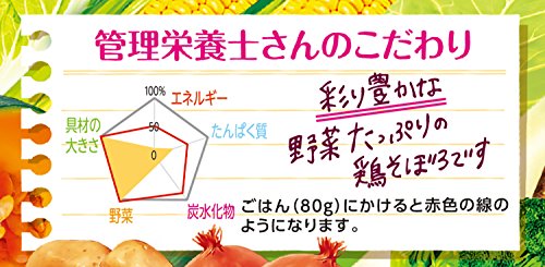 - 原材料:野菜(じゃがいも、たまねぎ、にんじん、かぼちゃ、キャベツ、だいこん、とうもろこし、しいたけ、えだまめ、ごぼう、ピーマン、ブロッコリー、白菜)、鶏肉、しょうゆ、砂糖、食塩、酵母エキス、しょうがエキス、増粘剤(加工でん粉)、(原材料の一部に小麦を含む)
