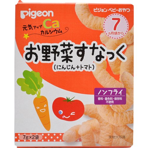 ●【商品説明】●「ピジョン 元気アップカルシウム お野菜すなっく にんじん+トマト 7g×2袋」は、野菜パウダーを練りこんで色鮮やかに仕上げた、赤ちゃんが食べやすいノンフライスナックです。●赤ちゃんの発育に必要なカルシウムが1袋(7g)あたり9mg含まれています。●保存や携帯に便利な小袋包装。●香料・着色料・保存料不使用。●7ヶ月頃から。●【ご注意】●※まれに、表面に黒い粒が見られることがありますが、原料の一部ですので、品質には問題ありません。●※開封後は吸湿しやすいので、なるべくお早めにお召し上がりください。●※本品は乳児用規格適用食品です。●※本品製造工場では、小麦・えびを含む製品を生産しています。●赤ちゃんがのどにつまらせないよう、おんぶしているときや横になっているときは与えないでください。●うまく飲み込めないことがありますので、お子様がお召し上がりになるときは、食べ終わるまで必ずそばで見守ってあげてください。●赤ちゃんが口にほおばりすぎないよう、量を調節してあげてください。●赤ちゃんが激しく泣いているときは与えないでください。●食べているときや食べ...