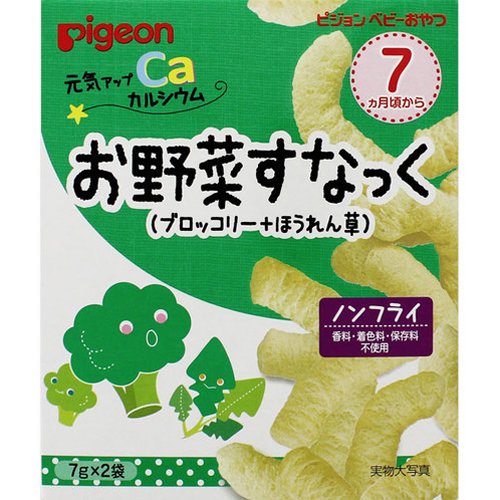 ●【商品説明】●「ピジョン 元気アップカルシウム お野菜すなっく(ブロッコリー+ほうれん草) 7g×2袋」は、赤ちゃんの発育に必要なカルシウムを1袋あたり12mg配合したベビーフード お菓子(7ヶ月頃から)です。●野菜パウダーを練りこんで色鮮やかに仕上げた、赤ちゃんが食べやすいスナックに仕上げています。●保存や携帯に便利な小袋包装です。●香料・着色料・保存料不使用。●ノンフライ製法で気になるカロリーも安心です。●【ご注意】●※表面に黒い粒が見られることがありますが、原料の一部ですので、品質には問題ありません。●※開封後は吸湿しやすいので、なるべくお早めにお召し上がりください。●※本品は乳児用規格適用食品です。●※本品製造工場では、えび・小麦を含む製品を生産しています。●赤ちゃんがのどにつまらせないよう、おんぶしているときや横になっているときは与えないでください。●うまく飲みこめないことがありますので、お子様がお召し上がりになるときは、食べ終わるまで必ずそばで見守ってあげてください。●赤ちゃんが口にほおばりすぎないよう、量を調節してあげてください。●赤ちゃんが...