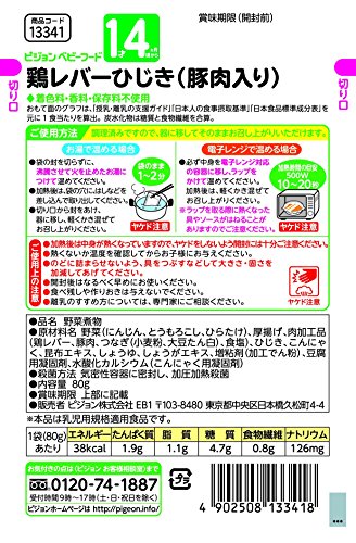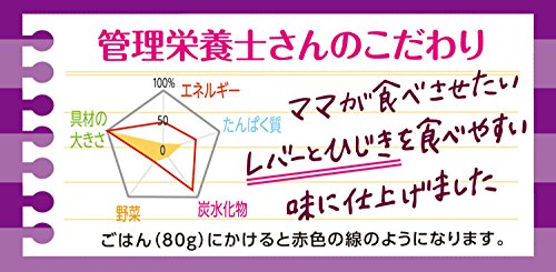 【原材料】 野菜(にんじん、とうもろこし、ひらたけ)、厚揚げ、肉加工品(鶏レバー、豚肉、つなぎ(小麦粉、大豆たん白)、食塩)、ひじき、こんにゃく、昆布エキス、しょうゆ、しょうがエキス、増粘剤(加工でん粉)、豆腐用凝固剤、水酸化カルシウム(こんにゃく用凝固剤) 【栄養成分(1袋(80g)あたり)】 エネルギー・・・38kcaL たんぱく質・・・1.9g 脂質・・・1.1g 糖質・・・4.7g 食物繊維・・・0.8g ナトリウム・・・126mg 【アレルギー物質】 小麦・大豆・鶏肉・豚肉 【使用方法】 ※調理済みですので、器に移してそのままお召し上がりいただけます。 ★お湯で温める場合 ・封を切らずに、沸騰させて火を止めたお湯に袋のまま1~2分つけて温めてください。 ・加熱後は、袋の穴に、はしなどを差し込んで取り出してください。 ・切り口から封をあけ、器に移し、軽くかき混ぜてお召し上がりください。 ★電子レンジで温める場合 ・必ず中身を電子レンジ対応の容器に移し、ラップをかけて温めてください。加熱後は、軽くかき混ぜてお召し上がりください。 (加熱時間の目安・・・10~20秒/500W) ※ラップを取る際に熱くなった具やソースがはねることがありますのでご注意ください。 【殺菌方法】 ・気密性容器に密封し、加圧加熱殺菌 【注意】 ・加熱後は中身が熱くなっていますので、やけどをしないよう開封には十分ご注意ください。 ・熱くないか温度を確認してからお子様にお与えください。 ・のどに詰まらせないよう、具をつぶすなどして大きさ・固さを加減してあげてください。 ・開封後はなるべく早めにお使いください。 ・食べ残しや作りおきは与えないでください。 ・離乳のすすめ方については、専門家にご相談ください。