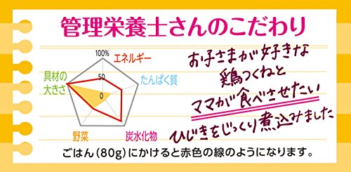 - 原材料:野菜(じゃがいも、にんじん、たまねぎ)、鶏団子(鶏肉、小麦粉、食塩)、ひじき、油揚げ、かつおだし、しょうゆ、砂糖、チキンエキス、食塩、酵母エキス、増粘剤(加工でん粉)