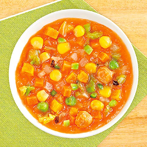 - 原材料:野菜(たまねぎ、にんじん、とうもろこし、グリンピース、かぼちゃ、キャベツ、だいこん、白菜、えだまめ(大豆を含む)、セロリ、ピーマン)、トマトピューレー(国内製造)、豆乳、鶏肉加工品(鶏肉、小麦粉、食塩)、チキンエキス、しいたけ水煮、酵母エキス、食塩/増粘剤(加工でん粉