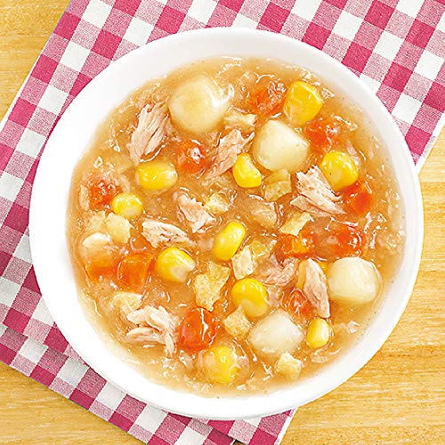 原材料:野菜(じゃがいも、にんじん、とうもろこし)、鮭(国産)、油揚げ(大豆を含む)、しょうゆ(小麦を含む)、昆布エキス、チキンエキス、砂糖、酵母エキス、しょうがエキス/増粘剤(加工でん粉)