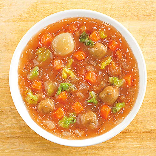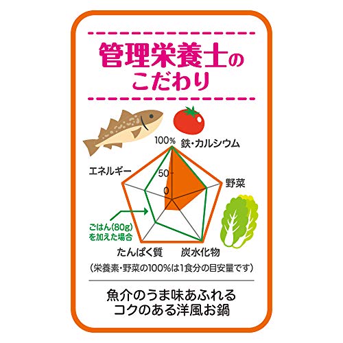 - 原材料:野菜(じゃがいも、にんじん、たまねぎ、白菜)、トマトピューレー(国内製造)、たら加工品(たら、つなぎ(パン粉(乳成分・大豆を含む)、小麦粉、小麦たん白、やまいも、乾燥卵白(卵を含む))、たまねぎ、砂糖)、砂糖、魚醤(さけを含む)、食塩/増粘剤(加工でん粉)、炭酸カルシウム、ピロリン酸第二鉄