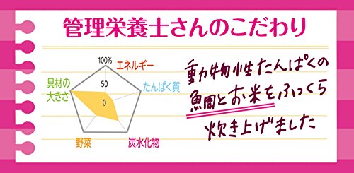 - 原材料:野菜(たまねぎ、にんじん、えだまめ、キャベツ、しいたけ)、精白米(国産)、春雨、鯛、チキンエキス、オイスターエキス、ごま油、食塩、増粘剤(加工でん粉)、(原材料の一部に小麦、大豆を含む)
