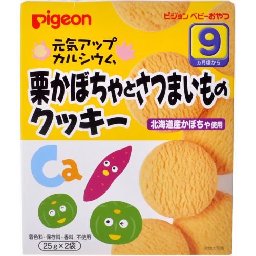 「元気アップ 栗かぼちゃとさつまいものクッキー」は、赤ちゃんの発育にあわせて持ちやすい形・食べやすい食感に仕上げたベビーフード クッキーです。かぼちゃとさつまいもを入れてさっくりと焼き上げました。野菜の風味と色を生かして自然な甘さに仕上げました。保存や携帯に便利な小袋包装です。 内容量:50g(25g×2袋) 使用上の注意 : ●うまく飲み込めないことがありますので、お子様がお召し上がりになるときは、食べ終わるまで必ずそばで見守ってあげてください。●赤ちゃんがのどにつまらせないよう、おんぶしているときや横になっているときは与えないでください。●慣れない頃は、白湯に浸すなど、水分を含ませてからあげてください。●食べているときや食べ終わった後は、白湯、果汁、麦茶等を飲ませてあげてください。●月齢は目安です。段階的に進めてください。 ご注意 : ●本製品に含まれるアレルギー物質:小麦・大豆●本品製造工場では、卵・乳を含む製品を製造しています。●茶色い粒がみられることがありますが、原料の一部です。味、品質には問題ありません。●開封後は中身が吸湿しやすいので、なるべく早めにお召し上がりください。 保存方法 : 直射日光および高温・多湿の場所を避けてください。 賞味期限の見方について この商品の賞味期限は、「西暦(下2桁)/月/日」の順番で表示されています。