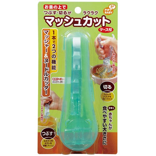 「ピップベビー フードタイム マッシュカット ケース付」は、お皿の上で手早く赤ちゃんが食べやすい大きさにできるマッシャー&ヌードルカッターです。持ち手を握り、マッシャー面で食べ物をつぶします。つぶしやすい突起付き。カッター部にめん類をはさみ込んでカットすればめん類を一度に何本もカットできます。分解してすみずみまで洗える清潔設計。外出先でも便利なケース付です。