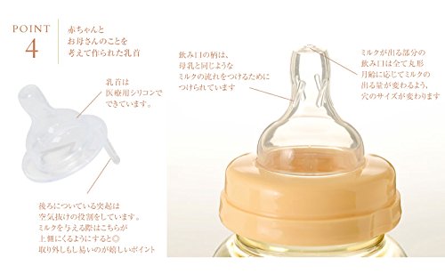 - 素材: 哺乳瓶:ポリエーテルサルホン 乳首:シリコン ※ポリエーテルサルホンは優れた耐熱性、耐久性素材(180℃まで十分な耐クリープ性)です。 耐寒性にも優れています。(-100℃まで) 酸・アルカリ・油に強いです。 プレミアムグレードのBPAフリーで匂いを吸収します。 乳首は医療用シリコンで出来ていますので赤ちゃんでも安心して使用して頂けます。