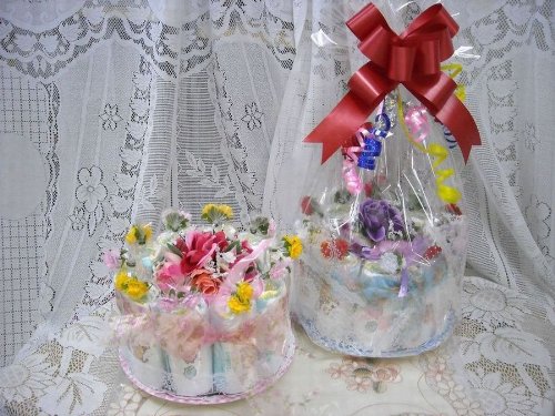 - おむつケーキサイズ : 直径約21cm 高さ約20cm(作成時期によりお花のデザイン等が変更になる場合がございます。ご了承くださいませ)