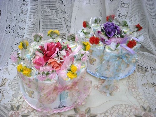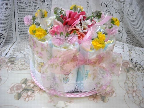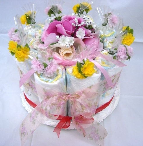 ご出産お祝い<おむつケーキ> リーズナブルなお値段のかわいいおむつケーキ フラワーB(女の子用ピンク系)