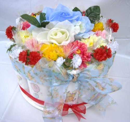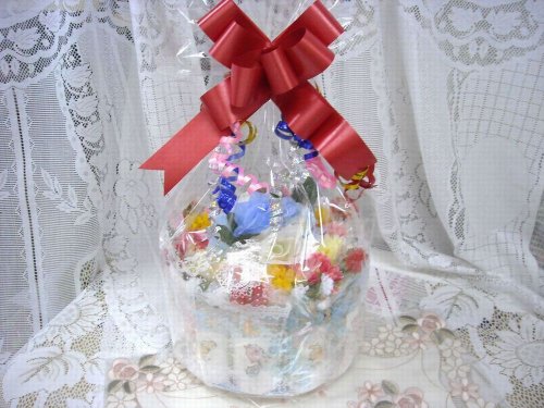 - おむつケーキサイズ : 直径約23cm 高さ約20cm(作成時期によりお花のデザイン等が変更になる場合がございます。ご了承くださいませ)