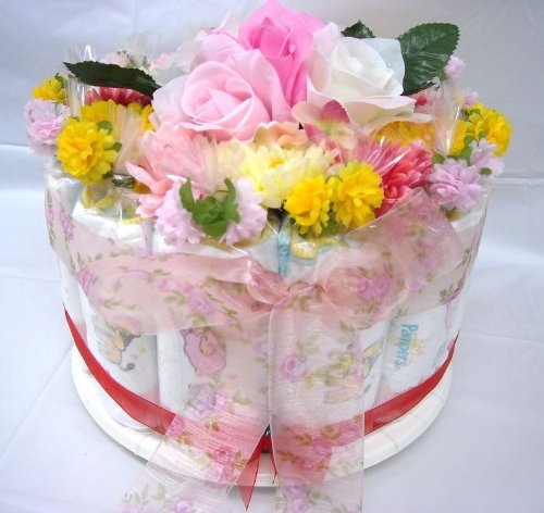 ご出産お祝い<おむつケーキ> リーズナブルなお値段のかわいいおむつケーキ フラワーC (女の子用ピンク系)