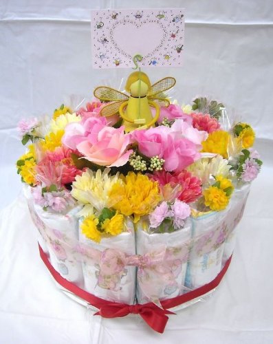 ご出産お祝い<おむつケーキ> リーズナブルなお値段のかわいいおむつケーキ メッセージE(女の子用ピンク系)