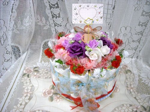- おむつケーキは飾ってお楽しみいただける様に全体を透明セロファンでカバーし、リボンラッピングしてございます(リボンラッピング後の高さ、約45cm)