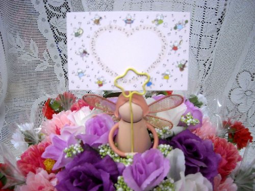 デコレーションフラワーやリボンの色調は、男の子用にブルー系、女の子用にピンク系で仕上げております. かわいい妖精がメッセージボードを掲げています。(お名前等が記入できます。ご連絡下さい) シーズンや作成時期により、使用するお花や付属品などが多少変わる事もございますが、全体のイメージが大きく変わることはございません