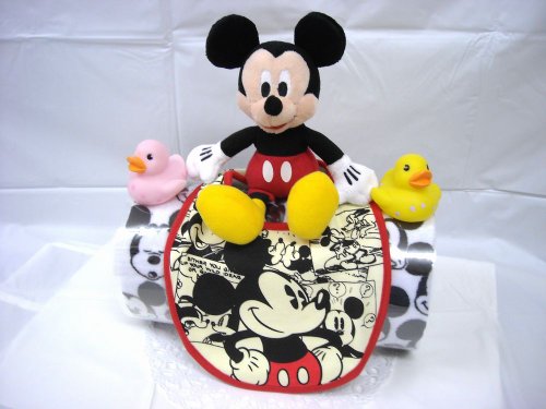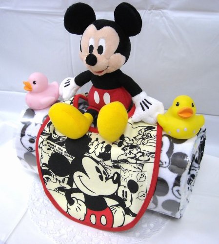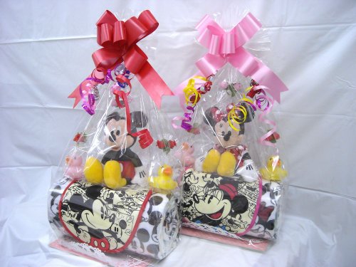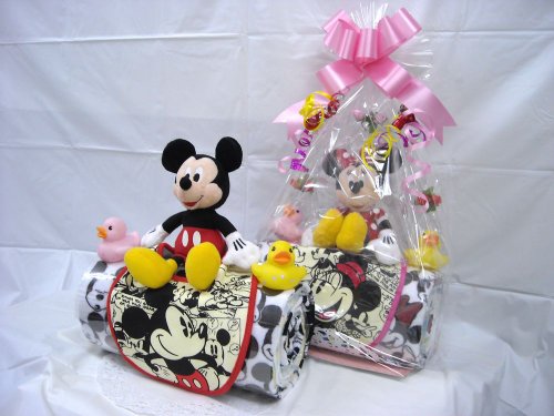 話題のロールケーキ風にアレンジされたオムツケーキです。個別包装されたおむつをディズニー柄のフェイスタオルで包みました。。 男の子用にミッキー、女の子用にミニ―ちゃんをご用意しました。それぞれに、ベビービブとおもちゃが付いています。 シーズンや作成時期により、使用するお花や付属品などが多少変わる事もございますが、全体のイメージが大きく変わることはございません。